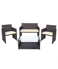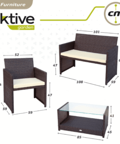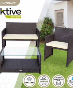 Transformez votre espace extérieur avec l’ensemble de mobilier de jardin Aktive Garden, comprenant deux fauteuils élégants et une table basse moderne. Fabriqué en rotin synthétique résistant aux intempéries et à l’eau, cet ensemble est à la fois durable et facile à entretenir. Chaque fauteuil est conçu pour le confort avec un coussin rembourré crème, tandis que la table basse est dotée d’un plateau en verre pratique pour le nettoyage. Idéal pour les petits espaces, cet ensemble est parfait pour une détente à l’intérieur comme à l’extérieur, ajoutant une touche de sophistication à votre jardin ou balcon. Dimensions des fauteuils : 54,5 x 59 x 79 cm ; canapé 108 x 59 x 76 cm ; table : 43,5 x 43,5 x 39 cm. Profitez de moments de convivialité avec style et confort.