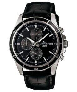 Cette montre chronographe de la collection Edifice incarne le parfait équilibre entre style sportif et sophistication. Son cadran noir profond avec sous-cadrans chronos, boîtier en acier poli et bracelet cuir façon crocodile en font un choix élégant pour les amateurs de précision et de classe.