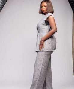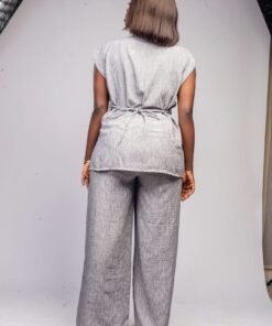 Ensemble gris sans manches texturé avec ceinture et bouton doré sculpté