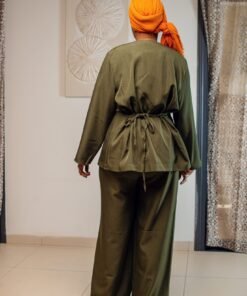 Ce deux-pièces se compose d’un pantalon fluide à jambes larges et d’une veste cintrée par un bouton bijou, subtilement évasée aux hanches. Confectionné dans un tissu mat et structuré, il est idéal pour les réunions importantes, les dîners d’affaires ou les sorties en ville. Son vert profond met en valeur toutes les silhouettes avec élégance.