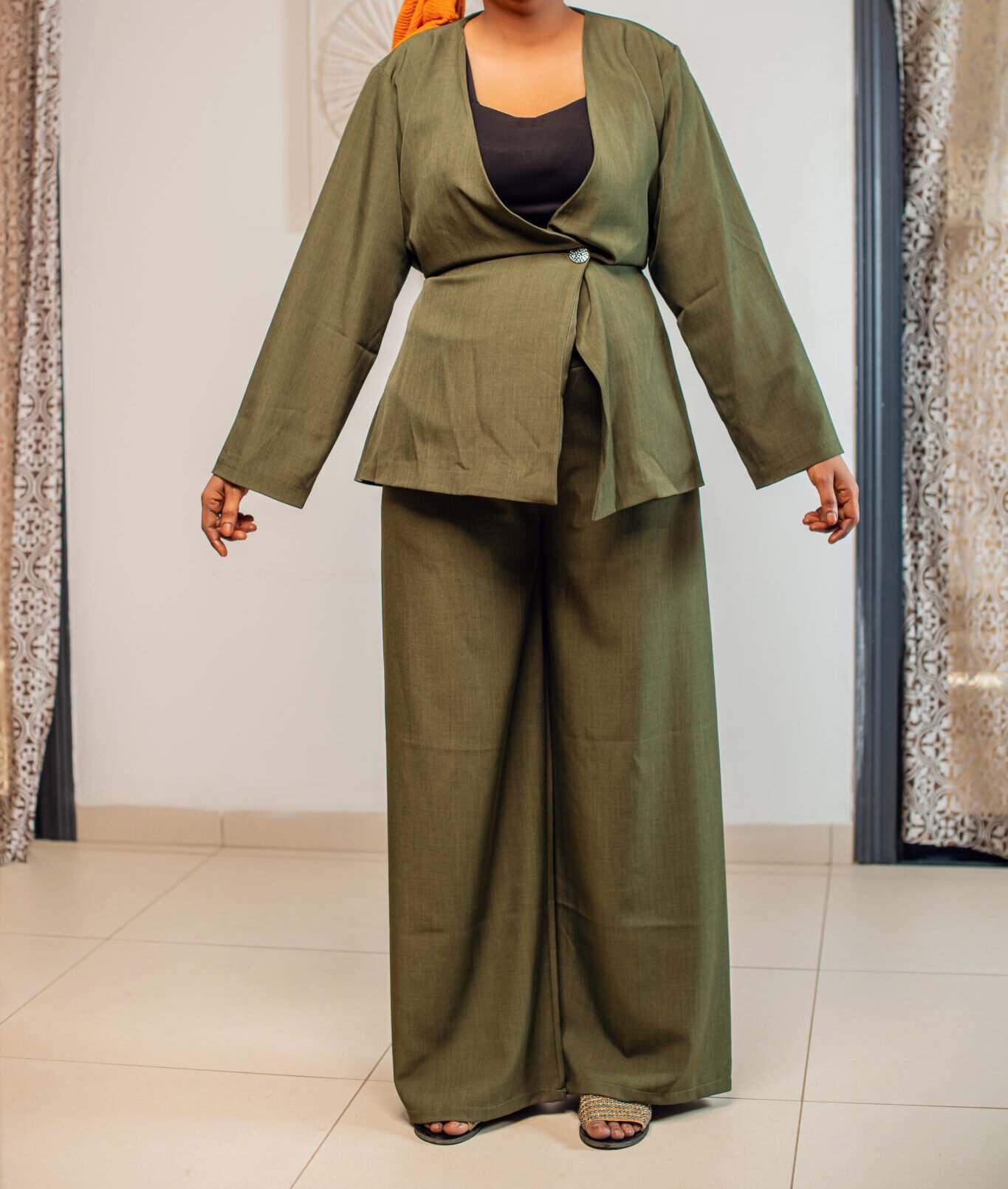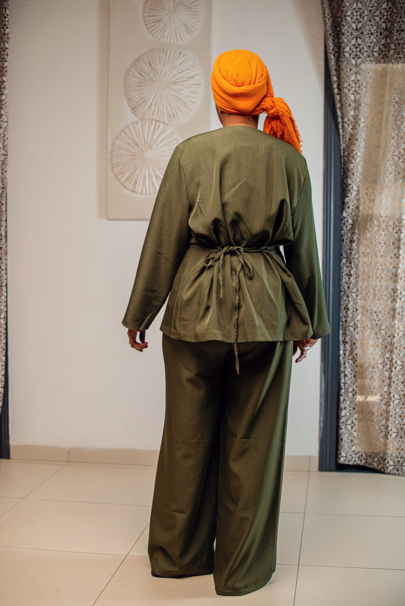 Ce deux-pièces se compose d’un pantalon fluide à jambes larges et d’une veste cintrée par un bouton bijou, subtilement évasée aux hanches. Confectionné dans un tissu mat et structuré, il est idéal pour les réunions importantes, les dîners d’affaires ou les sorties en ville. Son vert profond met en valeur toutes les silhouettes avec élégance.
