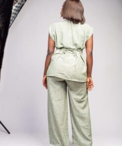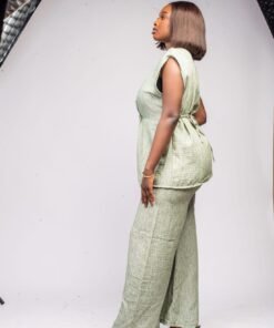 Ensemble vert sans manches texturé avec ceinture et bouton doré sculpté
