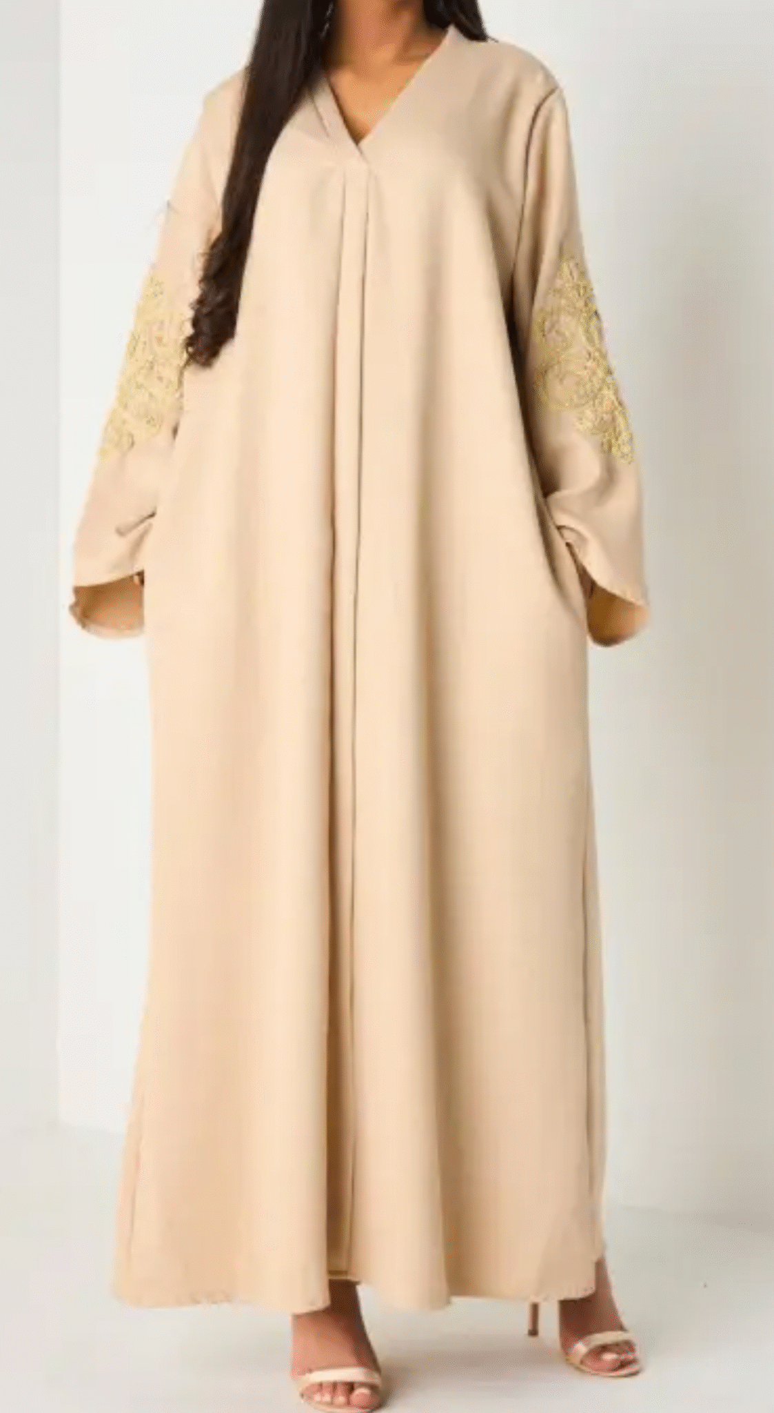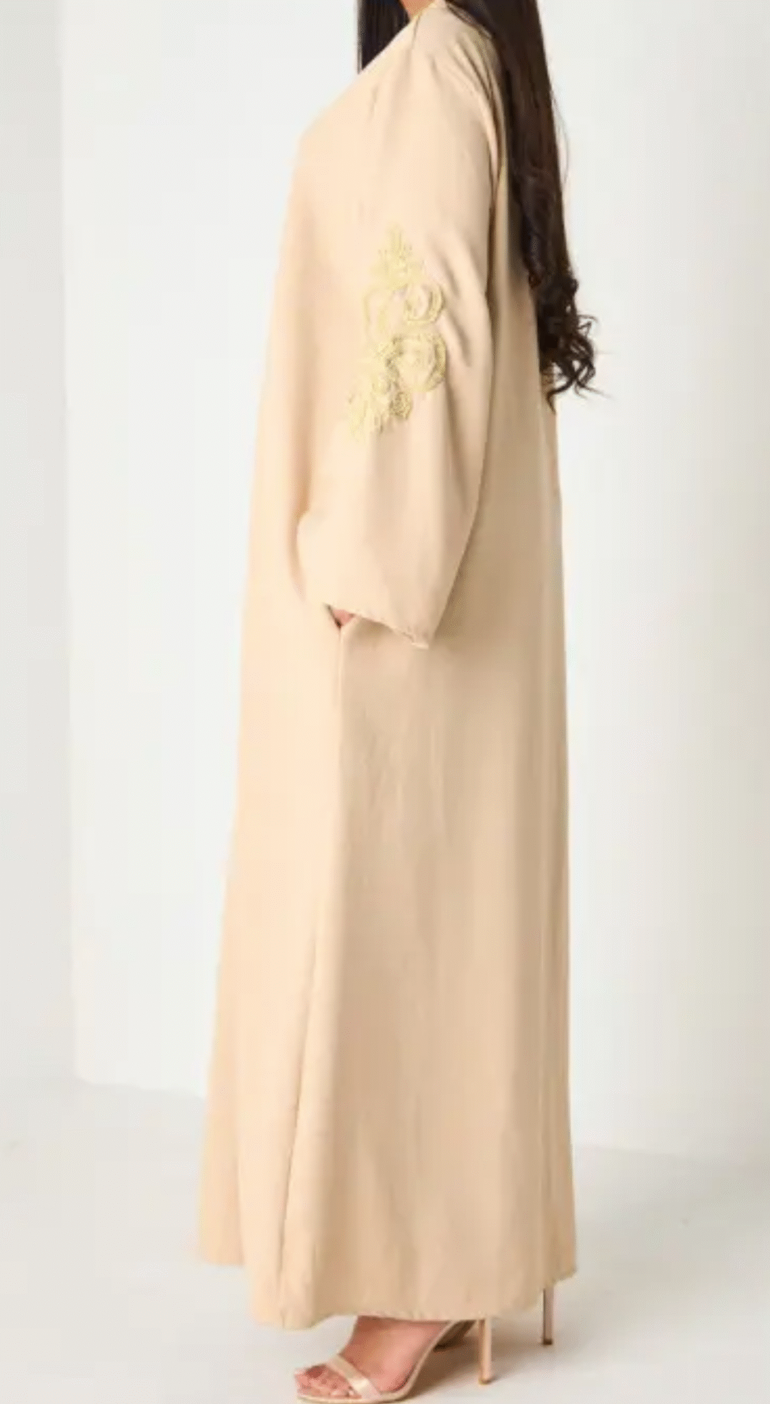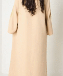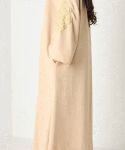 Laissez-vous séduire par cette somptueuse robe longue en beige foncé, subtilement illuminée par de délicates broderies de fleurs dorées. Un modèle qui allie charme, féminité et confort, idéal pour vos événements, soirées ou occasions spéciales.