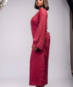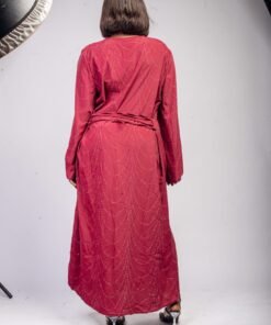 La robe Kenza séduit par son éclat maîtrisé. En mousseline fluide bordeaux, elle est délicatement ornée de perles fines formant un motif graphique irrésistible. Sa coupe droite est sublimée par un lien ajustable à la taille, pour une silhouette sur-mesure. Idéale pour les femmes audacieuses qui aiment se démarquer avec élégance, elle accompagne aussi bien les événements de jour que les soirées chics.