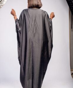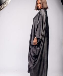 La robe Naïma est l’expression d’un raffinement discret mais affirmé. Son tissu noir satiné illuminé de cristaux fins lui confère un éclat sobre et une allure aérienne. Le drapé central rehaussé d’une broche en strass sublime la silhouette tout en garantissant un confort absolu. Parfaite pour les femmes qui veulent briller avec subtilité à Dakar, que ce soit pour une soirée, un cocktail ou une cérémonie élégante.