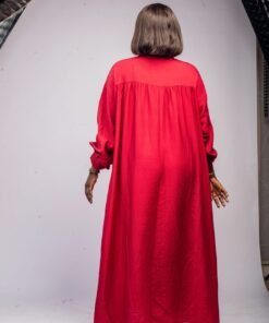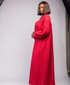 La robe Ndeye incarne l’élégance moderne avec sa coupe ample et aérienne, pensée pour la femme active et sophistiquée. Son col officier délicatement fendu structure l’encolure, tandis que les manches bouffantes apportent un volume maîtrisé. Confectionnée dans un tissu texturé rouge profond, elle offre légèreté et confort, idéale pour la chaleur dakaroise. Une pièce versatile qui passe du casual au chic selon les accessoires.